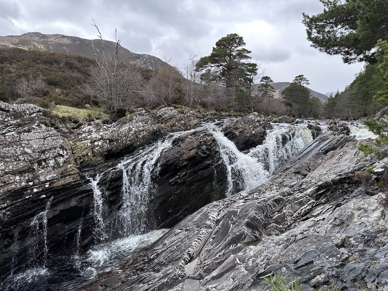 At Glencalvie Lodge we made a short detour to admire the impressive tree house before turning towards the Alladale Estate. Another wee detour took us to a viewpoint of the Eas Charron – waterfall before heading for Gleann Mor. The regeneration of the native woodland on the estate is fantastic with a beautiful mixture of trees. It was really very enjoyable.