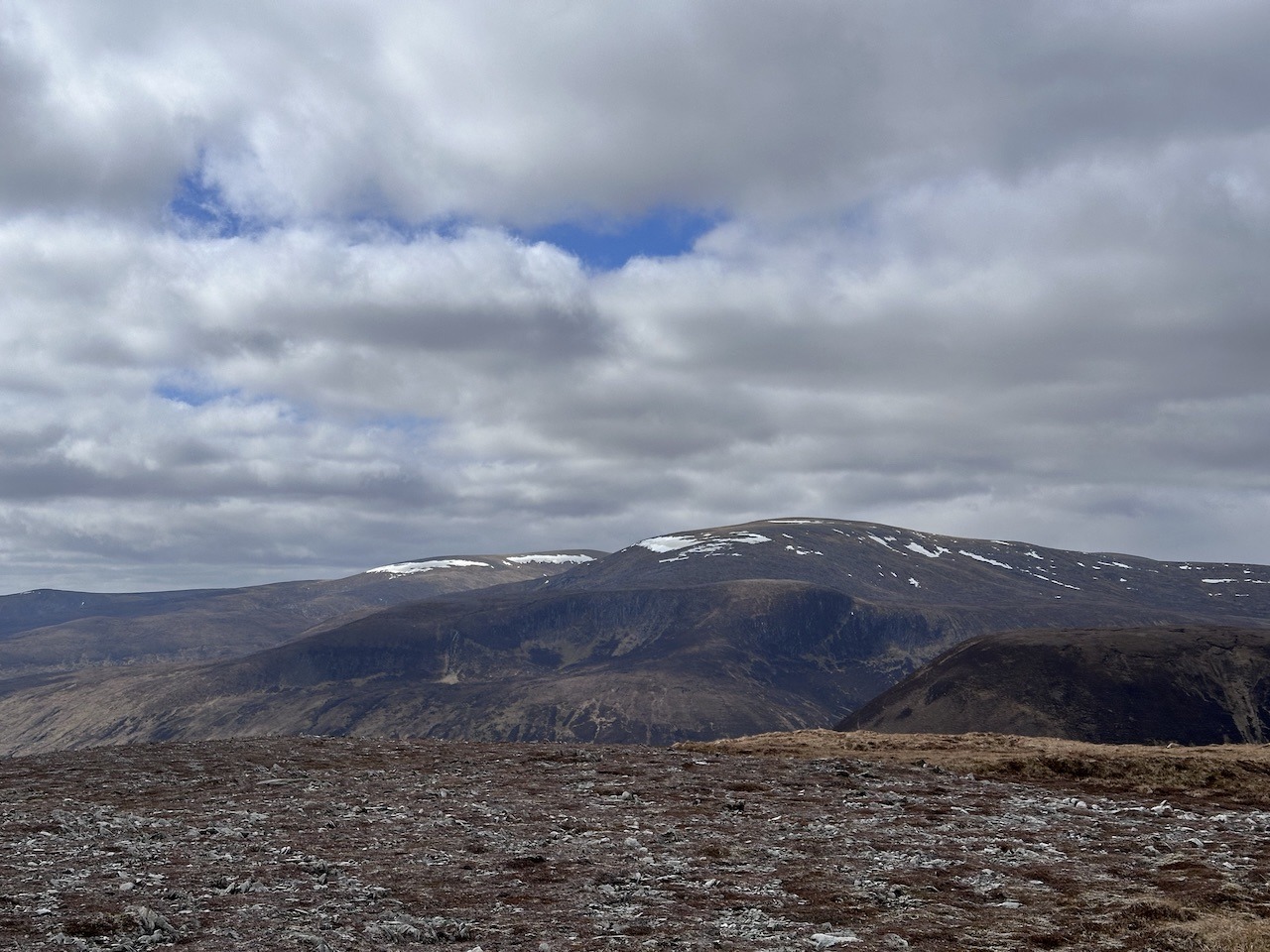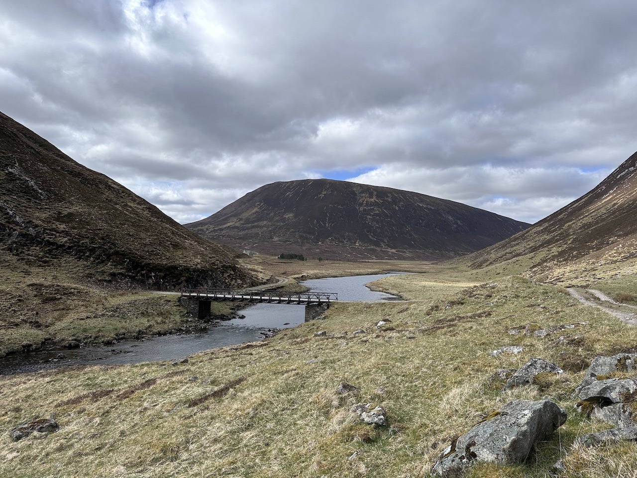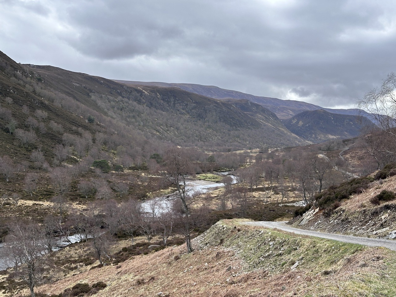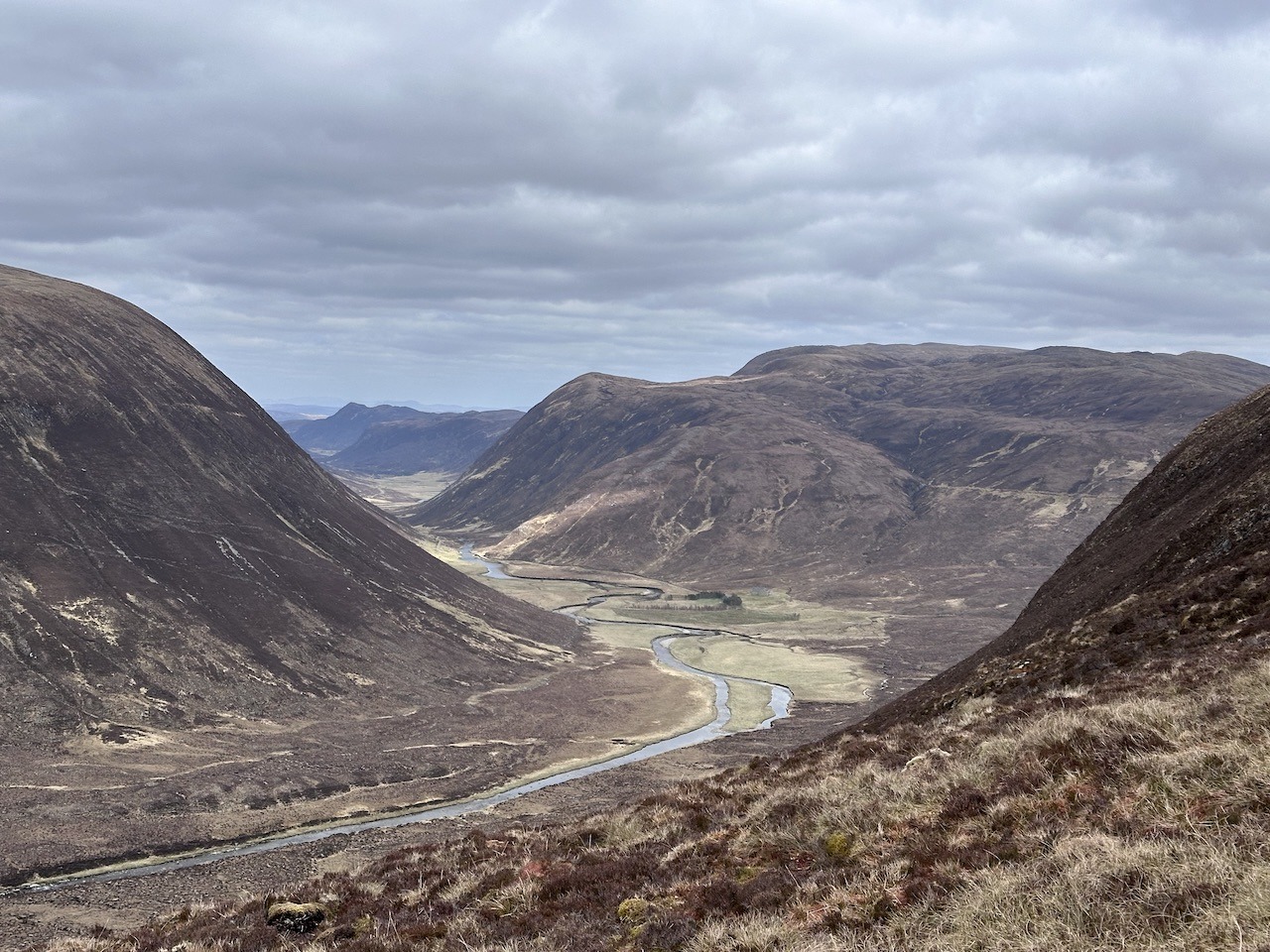 The route of a highland coast to coast took us through to Deanaich Lodge, but long before that we left the regenerating woodlands for the open glens. Quite a stark contrast. It was still a chilling wind so we found some shelter by the lodge for some food and drink. This was also the point at which we discussed a potential optional extra to our backpacking trip. Right ahead of us was Meall a’Chaorainn a Graham. We could traverse it I suggested if we left our big packs in the heather?