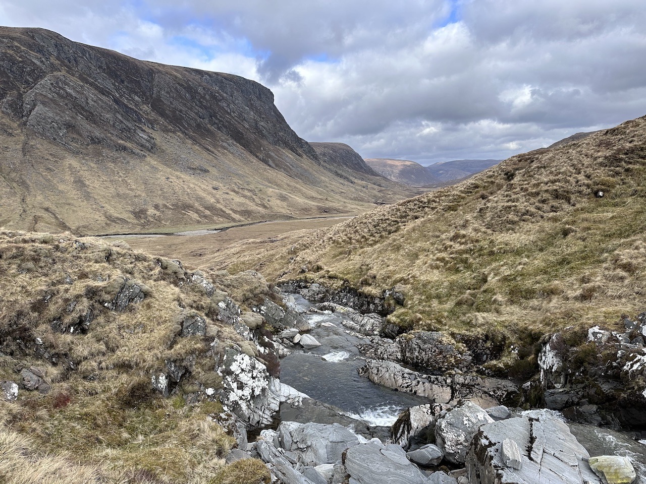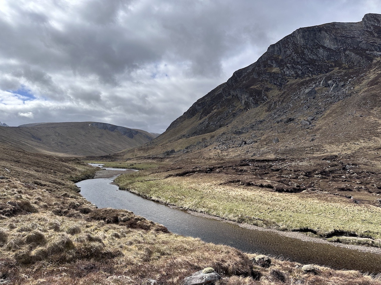 The track ends at a dam and sluice that I think takes water though towards Loch Vaich. It’s mainly pathless from here to Glenbeg bothy, but there was a faint quadbike track and regular deer trods making the walking easier. The scenery is fantastic with the steep sides of Gleann Beag and Eas Choul above the bothy. I went for a little explore after we arrived at the bothy and definietly some good swimming pools.
