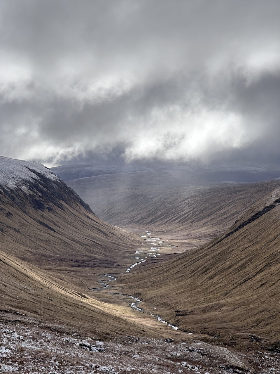 Our route was looking quite white as we walked into upper Gleann Beg and there were lots of deer low down. In the end the climb was pretty straightforward and even the stream crossings were easy. We climbed into the cloud and snow, but not for long because the cloud cleared to reveal Gleann Beg behind us. It was beautiful walking and after some food we continued through Coire an Lochan Sgeirich.
