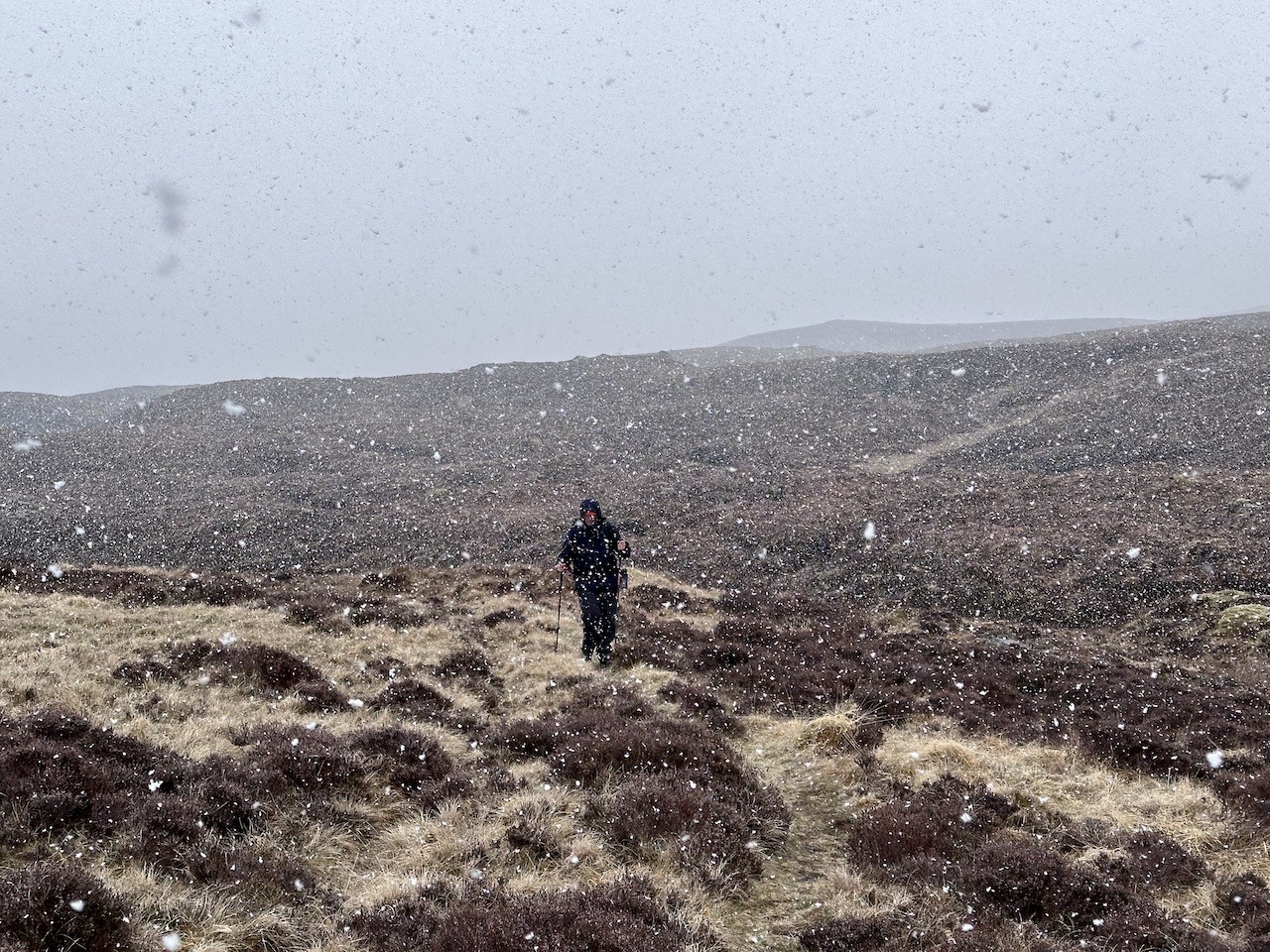It wasn’t long before we were following the stalkers path in the sun towards Inverlael. However, a final heavy snow shower engulfed us for an hour and it was the heaviest yet. When it finally cleared we had a very warm and sunny walk out to Inverlael. It got hotter and hotter!